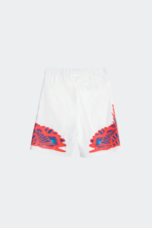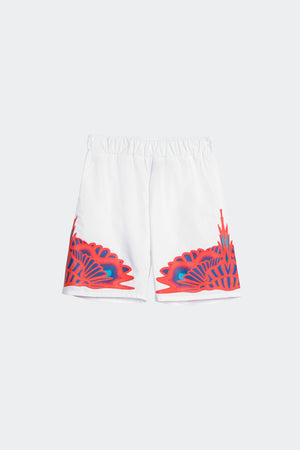 Bermuda in popeline di cotone dal fit morbido con vita elasticizzata per un comfort ottimale. Il fronte è caratterizzato da un design essenziale valorizzato da una stampa grafica a contrasto sul fondo gamba, che aggiunge un tocco deciso e contemporaneo. Il retro riprende la stessa stampa, mantenendo continuità estetica e forte identità visiva.
