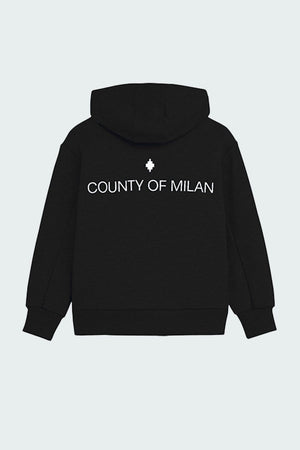Felpa con zip in 100% cotone dal fit morbido, dotata di cappuccio e tasca a marsupio. Logo geometrico stampato sul petto. Stampa "COUNTY OF MILAN" sul retro.