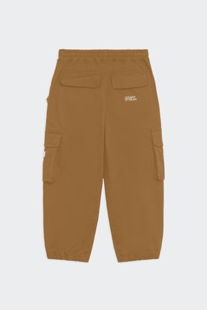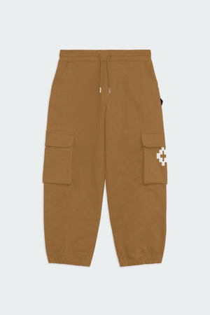 Pantalone cargo in gabardina di cotone con tasche laterali applicate e coulisse regolabile al fondo. Logo County of Milan ricamato sul retro e croce iconica ricamata su una delle tasche frontali.