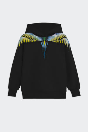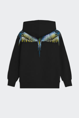 Felpa in 100% cotone dal fit morbido con cappuccio e tasca a marsupio. Stampa continua fronte e retro con motivo grafico iconico con ali e piumaggio multicolore.