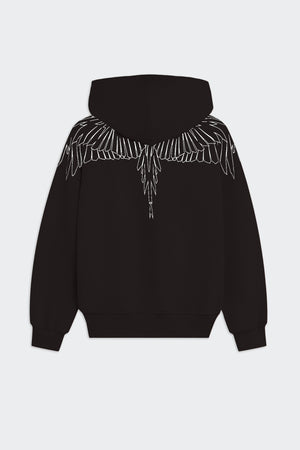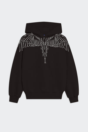 Felpa con cappuccio tinta unita con tasca a marsupio. Stampa continua di ali stilizzate geometriche sul fronte e sul retro. Polsini e fondo in costina.