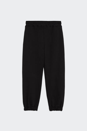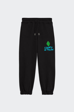 Pantaloni jogger in cotone nero con coulisse in vita e tasche laterali. Ricamo a contrasto con logo geometrico e scritta "COUNTY OF MILAN" sulla gamba anteriore.