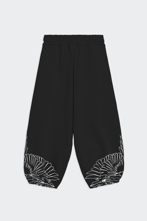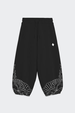 Pantaloni jogger in felpa di cotone dal taglio ampio, con polsino sul fondo e cintura elasticizzata. Ricamo logo geometrico sul davanti e stampa iconica ali stilizzate sul fondo del pantalone.
